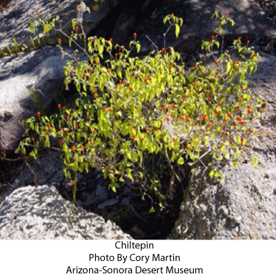 Chiltepins have long been used by native people to spice food and as a food preservative. Chiltepins were also used medicinally. The capsaicin is an antibacterial agent. The Pima Bajo people used chiltepins to relieve stomach disorders. The Mayo Indians mixed chiltepin leaves with alcohol to make a liniment for rheumatism. The Tarahumara Indians chewed the fruit with other plants for headache. Apparently capsaicin, when eaten, causes the brain to release endorphins, which are natural painkillers. Today, of course, you can buy capsaicin creams in the drug stores for topical pain relief.