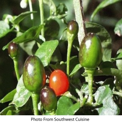 The pea-sized chiltepin pepper (Capsicum annuum var. glabriusculum) is thought to be the ancestral plant of all chili peppers. It is native to Arizona, Texas, Florida, Mexico, and Central and South America. The chiltepin plant is a bush that grows up to four feet tall and it prefers well-drained sandy soil.