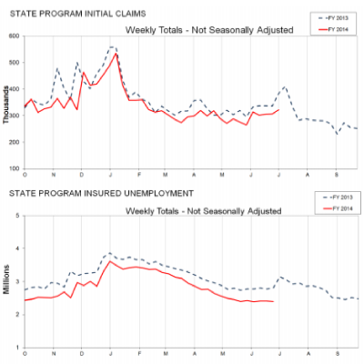 The advance number of actual initial claims under state programs, unadjusted, totaled 322,248 in the week ending July 5, an increase of 16,542 (or +5.4 percent) from the previous week. The seasonal factors had expected an increase of 28,394 (or + 9.3 percent) from the previous week. There were 383,811 initial claims in the comparable week in 2013. The advance unadjusted insured unemployment rate was 1.8 percent during the week ending June 28, unchanged from the prior week. The advance unadjusted number for persons claiming UI benefits in state programs totaled 2,393,005, a decrease of 18,627 (or -0.8 percent) from the preceding week. The seasonal factors had expected a decrease of 28,312 (or -1.2 percent) from the previous week. A year earlier the rate was 2.2 percent and the volume was 2,807,991.