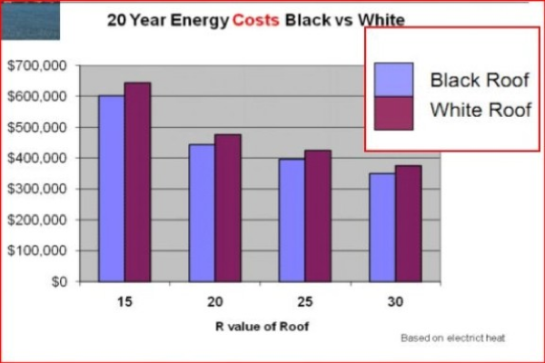 Because a white roof itself is cooler than a black roof, the white-roofed building is more prone to condensation build up inside the roof on winter days.