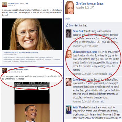 Dirty tricks by dark money doesn’t make much of an impression on the more informed primary voter, however Jones has also been haunted by Facebook posts that conservatives have found even more galling. According to the Sonoran Alliance and the National Review, which picked up the story, Jones told her Facebook friends to “get excited “and “find a way to support the new president of the United States of America.”