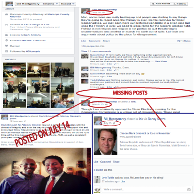 Facebook posts are now problematic for another political operative; Maricopa County Attorney Bill Montgomery, who is supporting Attorney General candidate Mark Brnovich. Disappearing from the prosecutor’s Facebook page are items posted between March 16, 2014 and July 30, 2014.
