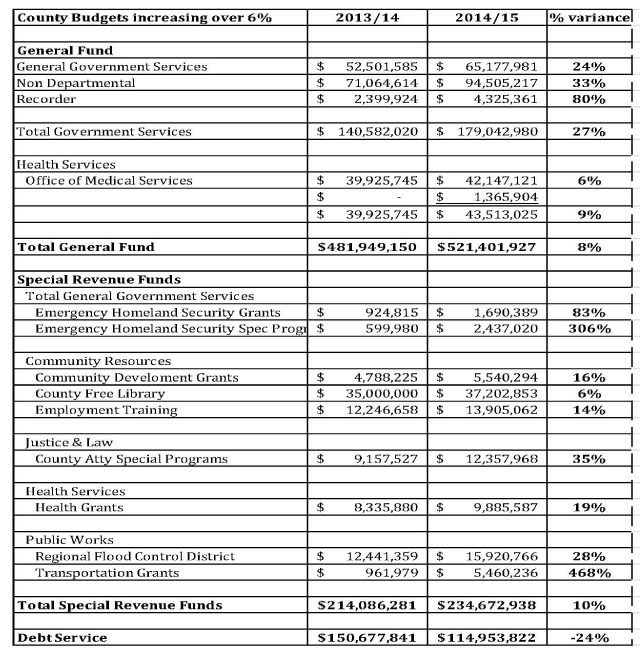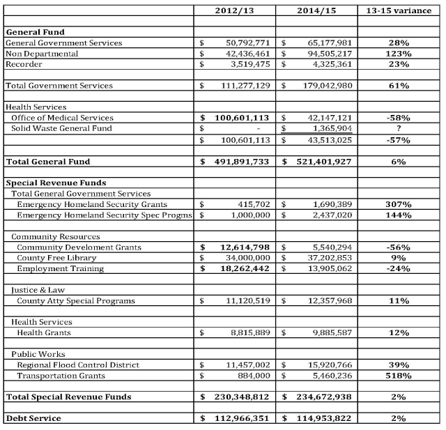 The budget is on the county’s website so locating it is not difficult. Hello Arizona Daily Star. Hello Biz Tucson. Did any of you review the final budget which was adopted? If one did, there would be questions that could be/should be asked of the county. Just by comparing 2013/2014 final year end numbers there are questions that need answers: