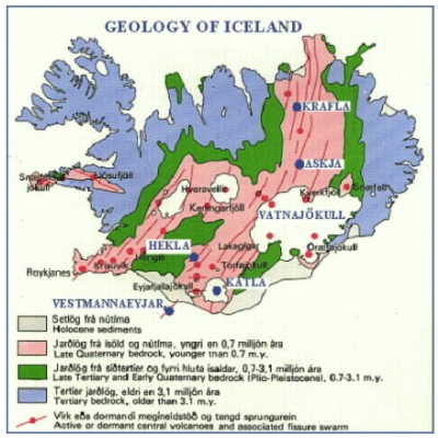 The general geology of Iceland is shown on the map below from the Nordic Volcanology Institute.