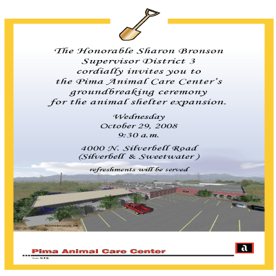 Although Huckelberry claims that the Pima County Animal Care Center has not had any improvement since the 1960s an invitation by Supervisor Sharon Bronson to a groundbreaking event is making the social networking rounds.