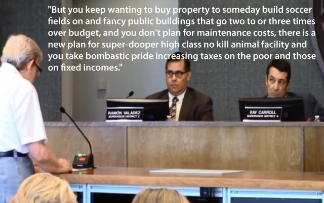 “But you keep wanting to buy property to someday build soccer fields on and fancy public buildings that go two to or three times over budget, and you don’t plan for maintenance costs, there is a new plan for super-dooper high class no kill animal facility and take your bombastic pride increasing taxes on the poor and those on fixed incomes.”