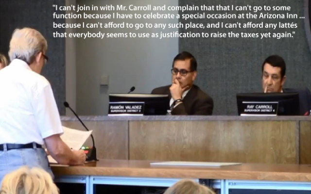 “I can’t join in with Mr. Carroll and complain that that I can’t go to some function because I have to celebrate a special occasion at the Arizona Inn … because I can’t afford to go to any such place and I can’t afford any lattés that everybody’s seems to use as justification to raise the taxes yet again.”