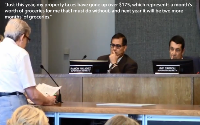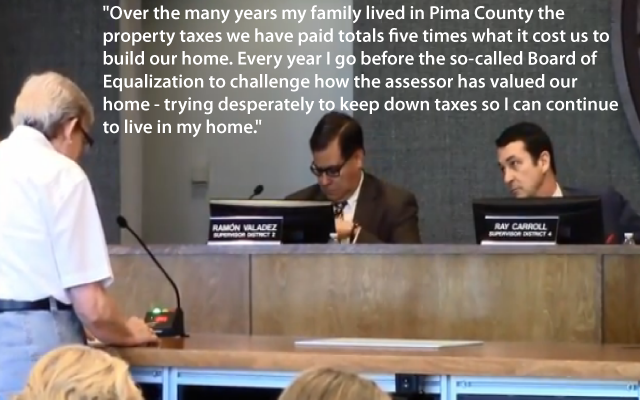 “Over the many years my family lived in Pima County the property taxes we have paid totals five times what it cost us to build our home. Every year I go before the so-called Board of Equalization to challenge how the assessor has valued our home – trying desperately to keep down taxes so I can continue to live in my home.”