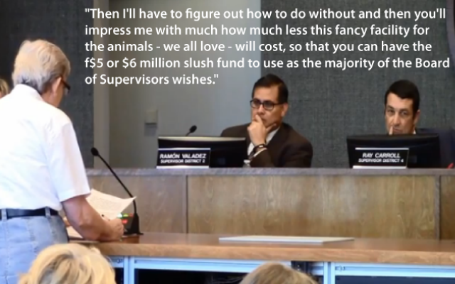 “Then I’ll have to figure out how to do without and then you’ll impress me with much how much less this fancy facility for the animals, we all love, will cost so that you can have the five or $6 million slush fund to use as the majority of the Board of Supervisors wishes.”