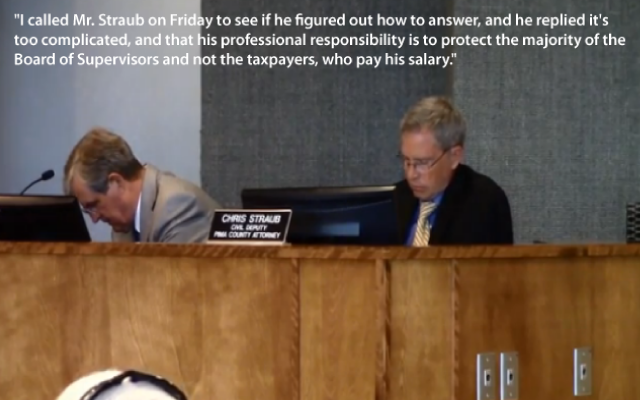 “I called Mr. Straub on Friday to see if he figured out how to answer, and he replied it’s too complicated, and that his professional responsibility is to protect the majority of the Board of Supervisors and not the taxpayers, who pay his salary.”