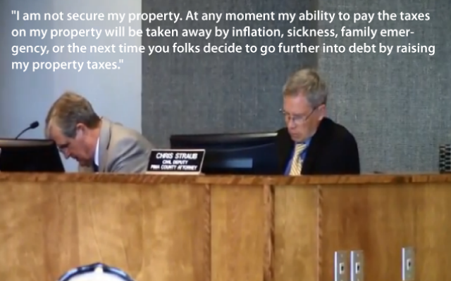 “I am not secure my property. At any moment my ability to pay the taxes on my property will be taken away by inflation, sickness, family emergency, or the next time you folks decide to go further into debt by raising my property taxes.”