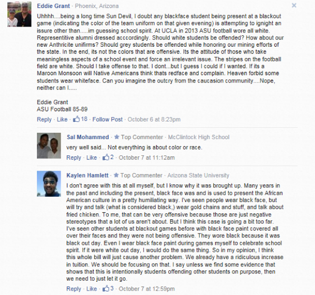 Not everyone shared Denman’s view. Former Sun Devil Eddie Grant appeared to hastily write on Facebook: “Uhhhh….being a long time Sun Devil, I doubt any blackface student being present at a blackout game (indicating the color of the team uniform on that given evening) is attempting to ignight an issue other than…..im guessing school spirit. At UCLA in 2013 ASU football wore all white. Representitive alumni dressed acccordingly. Should white students be offended? How about our new Anthricite unifirms? Should grey students be offended while honoring our mining efforts of the state. In the end, its not the colors that are offensive. Its the attitude of those who take meaningless aspects of a school event and force an irrelevant issue. The stripes on the football field are white. Should I take offense to that. I dont…but I guess I could if I wanted. If its a Maroon Monsoon will Native Americans think thats redface and complain. Heaven forbid some students wear whiteface. Can you imagine the outcry from the caucasion community….Nope, neither can I…..”