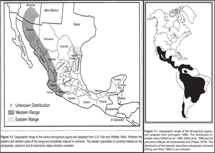 The range maps below put some perspective on the significance of the Arizona population relative to the population as a whole. However, environmentalists are still trying to get the Arizona population of pygmy owls listed as an endangered species.