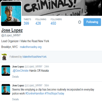 Lopez, Lead Organizer for Make the Road New York, also directed a tweet to new Jersey Governor Chris Christy: .@GovChristie Hands Off Assata, referring to Assata Shakur, and The Hands Off Assata Campaign. According to the campaign’s website, the campaign “is a coming together of organizations and individuals who are outraged by the heightened attempts by the federal government, congress of the united states and the state of new jersey to illegally force thru kidnapping a return of Assata Shakur from Cuba to the plantation United States.”