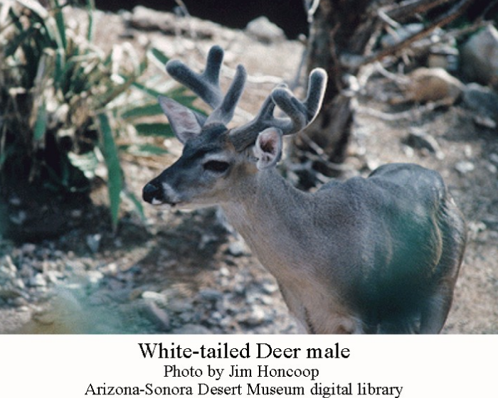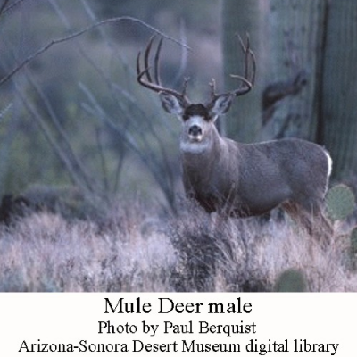 Two species of deer occur in the Sonoran Desert: the Mule deer (Odocoileus hemionus) and the smaller White-tailed deer (Odocoileus virginianus). The Mule deer is the one commonly seen around the Tucson Mountains and in suburbs. I’ve recently seen several crossing West Speedway. The White-tailed deer generally stays at higher elevations. The subspecies of White-tailed deer in southern Arizona is called the Coues’ White-tailed deer. Both deer are preyed upon by mountain lions, coyotes, bobcats, jaguars, and wolves.