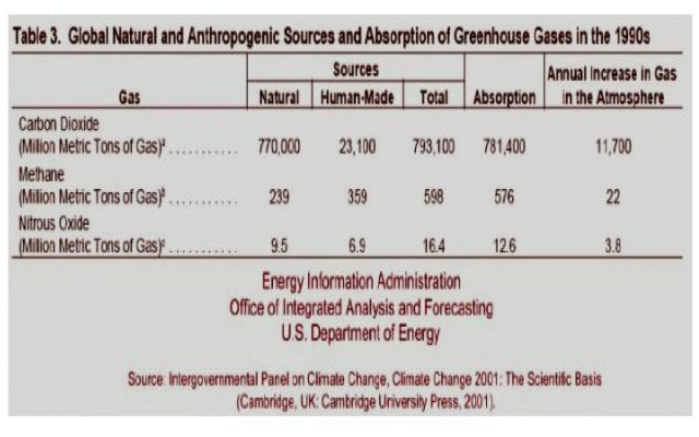 NASA has (perhaps unwittingly) provided proof that natural carbon dioxide emissions are responsible for most of the rise seen in atmospheric carbon dioxide. In fact, in 2001, the Energy Information Administration produced a table which shows (with a little arithmetic) that anthropogenic activities account for only 3 percent of the total annual carbon dioxide flux.
