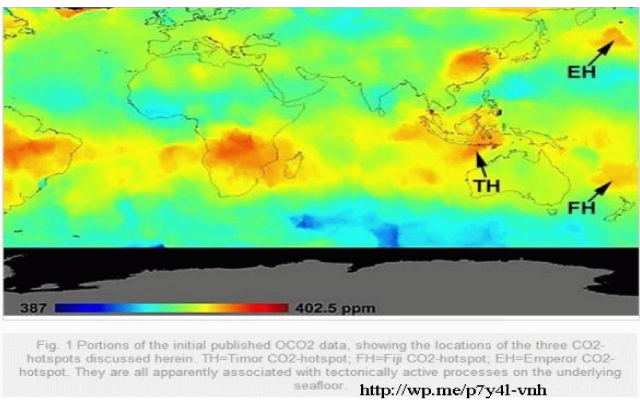 The hot spots in the Western Pacific (right side of graphic above) are interesting. Martin Hovland, Geophysicist and Professor Emeritus, Center for Geobiology, University of Bergen, Norway, suggests these carbon dioxide emissions are from volcanoes and tectonically active areas on the sea floor. (See his post here).