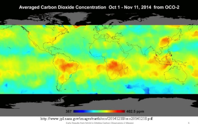 NASA has just released data from that satellite for the period October 1 through November 11, 2014. Brighter colors on the map show areas with higher concentrations of carbon dioxide in the atmosphere. Presumably, those areas are emitting carbon dioxide. The surprise is that the Southern Hemisphere is the big emitter during this time period, not the Northern Hemisphere where we are burning fossil fuels to generate electricity, run our automobiles, and heat our homes and businesses. The only exception seems to be China where they are burning great quantities of coal.