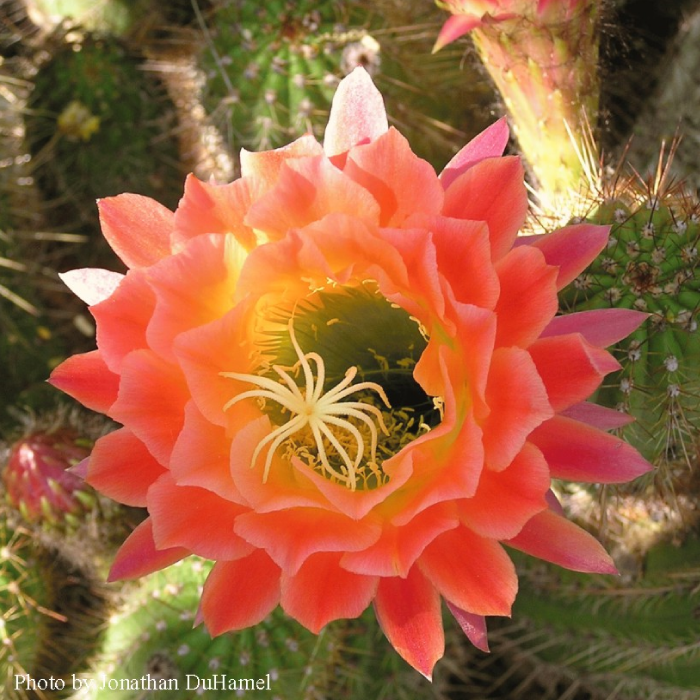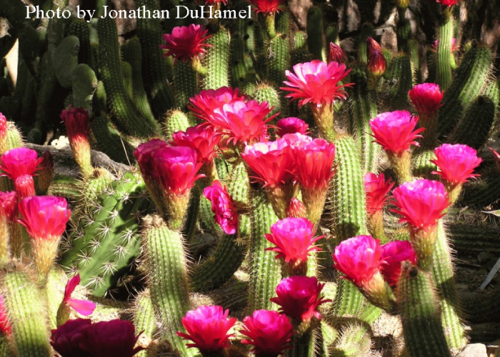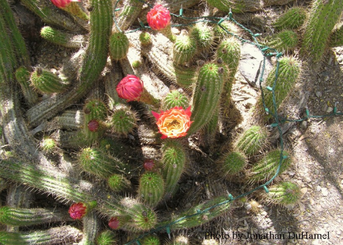 Flowers, two to four inches across bloom in the spring. The flowers are nocturnally blooming and exist for only about 18 hours, similar to saguaro flowers. Flower color ranges from deep red to orange and yellow depending on the cultivar.