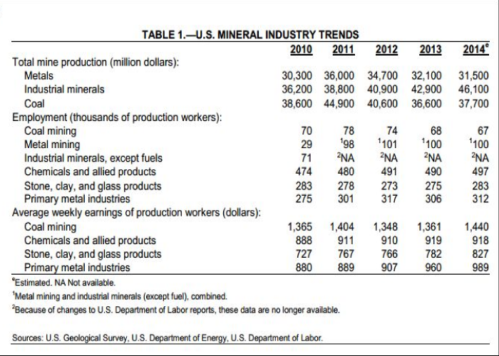 “The estimated value of U.S. metal mine production in 2014 was $31.5 billion, slightly less than that of 2013. Principal contributors to the total value of metal mine production in 2014 were copper (32%), gold (27%), iron ore (16%), molybdenum (10%), and zinc (6%). Changes in average prices for domestically mined metals were mixed in 2014. After increased yearly average prices from 2002–12, gold prices decreased for the second consecutive year. The estimated value of U.S. industrial minerals mine production in 2014 was $46.1 billion, about 7% more than that of 2013. The value of industrial minerals mine production in 2013 was dominated by crushed stone (28%), cement (17%), and construction sand and gravel (15%). In general, industrial minerals prices increased slightly.”