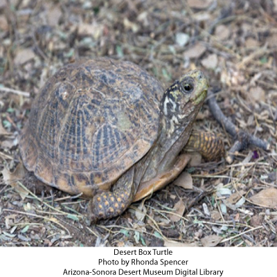 There are several species of box turtles. The one common to Arizona is Terrapene ornata and is variously called the Desert Box Turtle, the Ornate Box Turtle, and the Western Ornate Box Turtle.