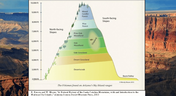 Temperate plants and animals retreated to higher elevations forming what we today call “Sky Islands.” With higher elevation comes cooler temperatures and more rain. Traveling the road from downtown Tucson to the top of the Santa Catalina mountains will pass through eight plant biomes.