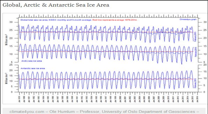 As you can see from the graph below global sea ice extent is nearly on average since 1979 according to satellite measurement. Arctic sea ice is slightly below average and Antarctic sea ice is above average. The total sea ice extent shows no obvious influence from global warming.