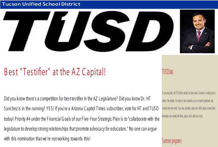 “Best “Testifier” at the AZ Capital! Did you know there’s a competition for best testifier in the AZ Legislature? Did you know Dr. HT Sanchez is in the running? YES! If you’re a Arizona Capitol Times subscriber, vote for HT and TUSD today! Priority #4 under the Financial Goals of our Five-Year Strategic Plan is to “collaborate with the legislature to develop strong relationships that promote advocacy for education.” No one can argue with this nomination that we’re not working towards this! http://azcapitoltimes.com/2015-best-of-the-capitol/