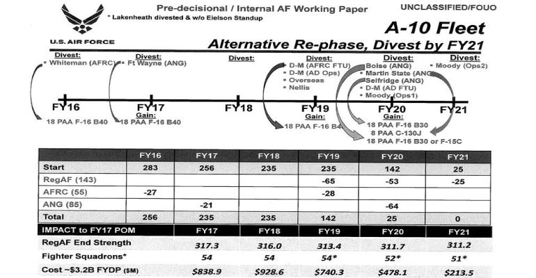 According to a pre-decisional/internal USAF working paper, A-10 Fleet Alternative Re-phase, Divest by FY21, senators are taking a USAF F-16 payoff at the expense of the ground troops and their families within the senators’ states.