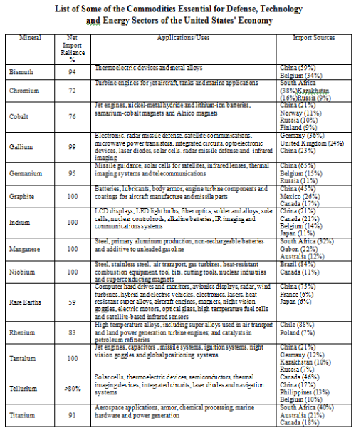 Source: Mineral Commodity Summaries 2015 published by the U. S. Geological Survey and Strategic and Critical Materials 2015 Report on Stockpile Requirements published by the Department of Defense.
