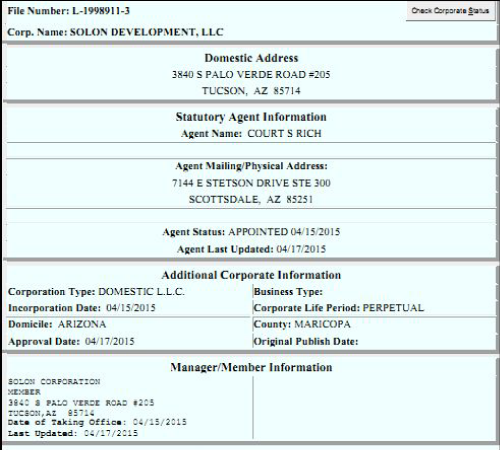I characterized Solon Development as a local company because it was so reported in the (always accurate?) Arizona Daily Star. But some research by me and ADI staff raises some questions.