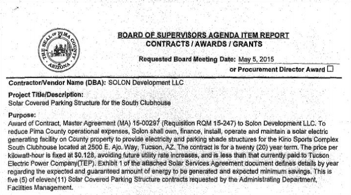 In a previous article, Pima County’s Solar Power Math, I reported “Pima County has agreed to buy $22 million worth of solar-produced electricity over a period of 20 years from Solon Development, a local company which received a no-bid contract from the County.”