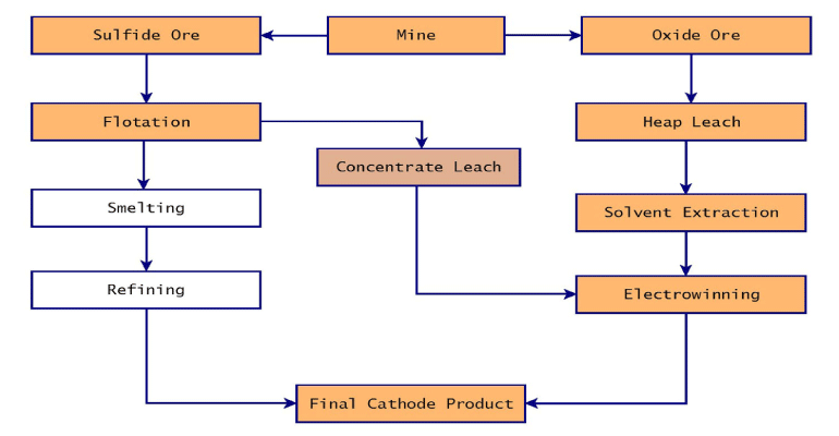 Conventional treatment of sulfide copper ores begins at the mine site, where the copper-bearing minerals are physically separated from the rest of the rock at a mill facility, which is known as a concentrator. Here the ore from the mine (grade averages 0.25% to 0.50% copper) is initially reduced to a consistency of a fine sand by crushing and grinding circuits. The finely ground ore is directed through a series of flotation tanks that produce a concentrate product, which generally averages about 30% copper. The copper concentrates are then shipped to a smelter and refinery that produce a final copper cathode product, containing 99.99% copper.