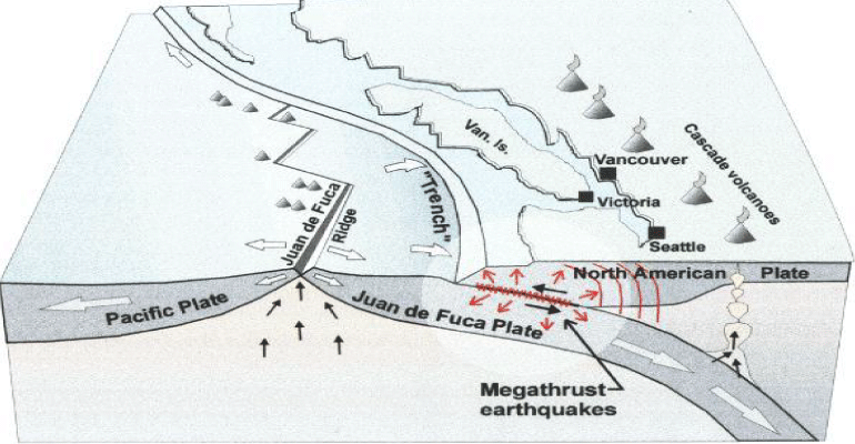 “At 9PM on January 26, 1700 one of the world’s largest earthquakes occurred along the west coast of North America. The undersea Cascadia thrust fault ruptured along a 1000 km length, from mid Vancouver Island to northern California in a great earthquake, producing tremendous shaking and a huge tsunami that swept across the Pacific. The Cascadia fault is the boundary between two of the Earth’s tectonic plates: the smaller offshore Juan de Fuca plate that is sliding under the much larger North American plate.” That earthquake is estimated to have been magnitude 9.0. You can read accounts of it here and a paper recounting American Indian stories about an M7.3 earthquake along the related Seattle fault that happened about A.D. 900.