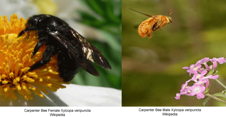 DesertUSA goes on to note: “The damage done by carpenter bees to residence in a wooden structure is usually quite superficial. However, given enough time and enough seasons spent in the nest, the Carpenter Bee can chew a simple, but prolific tunnel & gallery network through a house’s timbers. Therefore, it is important to exterminate carpenter bees that have infested your home.”