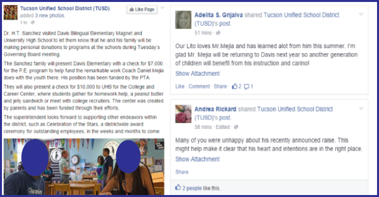 Almost immediately after the message appeared on Facebook, questions were raised as to how Sanchez determined which schools would benefit from his big win. All of TUSD’s schools are facing money problems and teachers continue to by materials for their classrooms out of their own pockets.