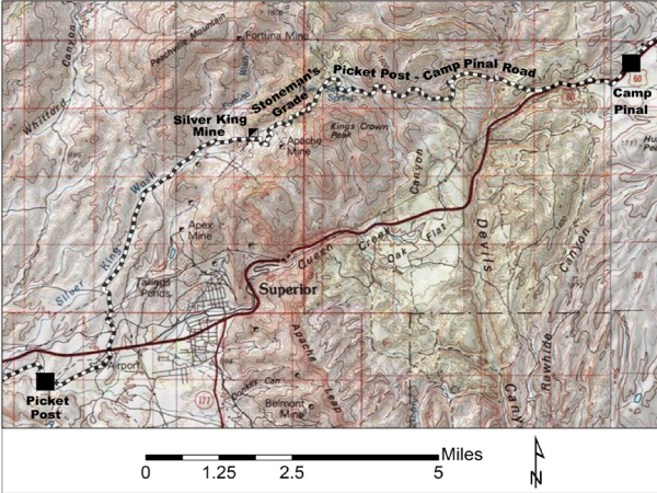 In November 1870, General George Stoneman, the military commander of the Arizona Territory, erected a small military camp near the base of Picket Post Mountain and began construction of a road to the proposed site of Camp Pinal, a second military post in the Pinal Mountains. Completed in April 1871, this road meandered north from Camp Picket Post on Queen Creek about three miles west of the present town site of Superior, Arizona to a point along Silver King Wash; followed Silver King wash north to a point north of its junction with Comstock Wash. There it crossed the range at “Stoneman’s Grade”, where it dropped into the upper reaches of the Queen Creek drainage before emerging just north of Oak Flat, crossing Devils Canyon and continuing east to Camp Pinal, located near the present day community of Top of the World.