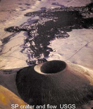 The younger volcanic cones and their flows are basaltic, such as SP crater (71,000 years old) and Sunset Crater. According to the USGS, “Most of the more than 600 volcanoes in the San Francisco Volcanic Field are basalt cinder cones. Basalt has the lowest viscosity of all common magmas. Cinder cones are relatively small, usually less than 1,000 feet tall, and form within months to years. They are built when gas-charged frothy blobs of basalt magma are erupted as an upward spray, or lava fountain. During flight, these lava blobs cool and fall back to the ground as dark volcanic rock containing cavities created by trapped gas bubbles. If small, these fragments of rock are called “cinders” and, if larger, “bombs.” As the fragments accumulate, they build a cone-shaped hill. Once sufficient gas pressure has been released from the supply of magma, lava oozes quietly out to form a lava flow. This lava typically squeezes out from the base of the cone and tends to flow away for a substantial distance because of its low viscosity. SP Crater, 25 miles north of Flagstaff, is an excellent example of a cinder cone and its associated lava flow.”