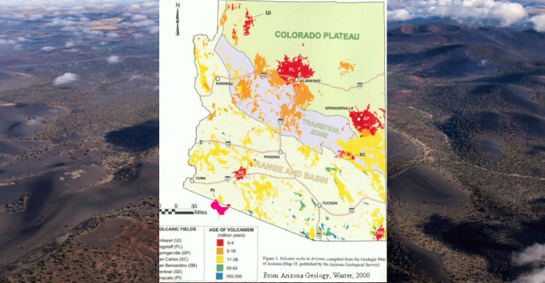 The map below, from the Arizona Geological Survey shows the location of these recent and older volcanic fields. This article discusses those shown in red.