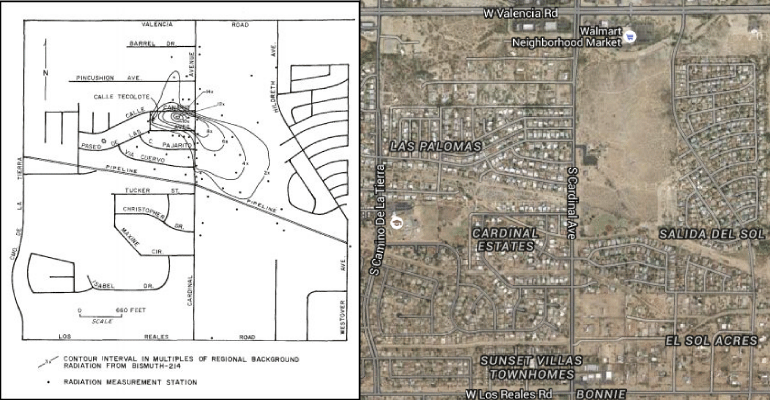There is one known occurrence in the Tucson area near the intersection of Valencia and Cardinal Avenue. There, limestone contains thin yellow veinlets of the uranium mineral carnotite. A survey of the area with a gamma-ray spectrometer (a uranium-prospecting instrument) revealed that uranium concentrations vary from near the background (normal) level at the edge of the anomalous area to approximately 14 times the background level at the center. Chemical analyses indicate that uranium concentrations are as high as 20 ppm at the center of the anomaly, according to the AZGS. Several dozen houses are built on the limestone, many of which had radon levels greater than the EPA limit of 4 pCi/1(pico-curies per liter when tested in 1987 by the Pima County Health Department. (See map for exact location. The map shows radioactive bismuth, a daughter product of radon decay.)