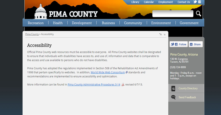 Huckelberry admits in his memo that instructions for the public seeking accommodations are only found on the Clerk of the Board’s Meeting Agenda cover page. In fact, a quick review of the Pima County website shows that the only apparent reference to accessibility is a tab on the home page that leads the public to rules regarding the accessibility of the website. As a result, it would not be surprising that a member of the public seeking an accommodation would contact the supervisor requesting assistance.
