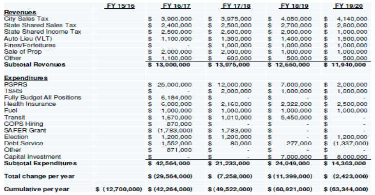 Kozachik is pushing for a tax increase. He wrote in his newsletter dated January 11: “Simply put, as we start this year’s budget discussions, we are facing a $42M hole. By doing nothing in the form of cost cutting and/or increasing revenues, that jumps to over $63M in three years. Much of that comes from the public safety pension, and very little of it will be affected by the May special election you may see that will be touted as a ‘fix’ to those pension costs. As you can see from the opening table, we’ll still be left with year-to-year obligations for current retirees and employees, regardless of what sort of hybrid system they propose for future hires.”