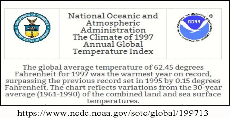 Apparently, NOAA did not check its own temperature record, because their report on 1997 (another El Nino year) said that the global average temperature was 62.45 degrees Fahrenheit (and it was touted as the warmest year on record). (Source) Here is a screen capture, just in case the 1997 report disappears: