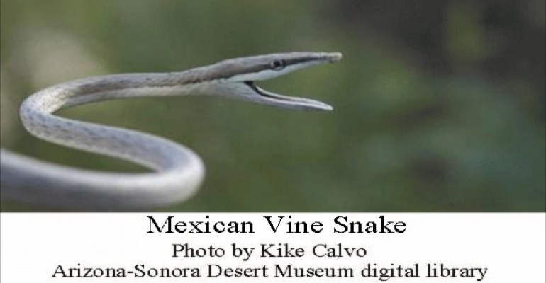 According to the Tucson Herpetological Society vine snakes sleep in loose coils in trees and shrubs at least six feet off the ground. “They have been observed from March into November in our area, although most are found during the summer rainy season. The vast majority of records are for the Pajarito-Atascosa Mountain range complex, from about Walker Canyon east to Arivaca Lake and Ruby. A specimen was collected in 1968 from ‘near Washington Camp’ in the Patagonia Mountains. There are at least four unconfirmed (no photos or specimens) reports from the western flank of the Santa Rita Mountains (Montosa Canyon and Agua Caliente Cave), and a similarly unconfirmed report from Thomas Canyon on the eastern slope of the Baboquivari Mountains.”