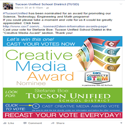 Currently, Boe is using District resources to encourage the District’s Facebook friends to: “Cast your vote for Stefanie Boe: Tucson Unified School District in the “Creative Media Award” section” of the second annual Cox Connect2STEM Awards. According to the Cox website, “Each Cox Connect2STEM Award Winner will receive $1,000 donated to a STEM non-profit program in their name. The winners will also be profiled in a video highlighting their contributions to STEM. Finally, all winners will be recognized in a congratulatory spot that will run across all Cox channels.”