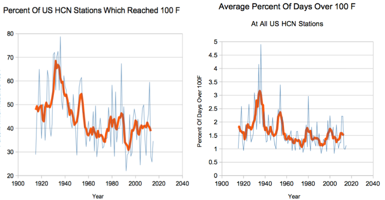 By the way: The frequency of 90 degree days and 100 degree days has plummeted across most of the US since the 1930’s, see graphs.