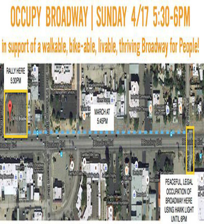 occupyThe signs were all stolen within a few hours of installation, between 10 and 11 a.m., according to an email sent to Tucson City Councilmembers. “At least four individuals in two different vehicles are recognizable on security camera video drove along Broadway, parking, exiting the vehicles, pulling out the signs, and returning with them to their cars. A Tucson police officer witnessed the activity, but mistakenly thought the group was putting up signs. One of the cars was identified at the Broadway Coalition rally Sunday night, and some of the signs that were removed from the 1600 block of E. Broadway Sunday morning were recovered from a dumpster at 48 N Tucson Blvd. (a block away from the rally location) at 6:30 p.m. Sunday night,” reads the email.