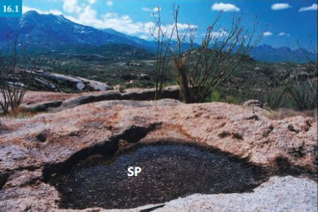 Many relatively level granite surfaces in this area contain flat-bottomed, circular depressions that commonly have overhanging sidewalls. These solution pans or gnammas (Scrabble player alert), which are up to 3 feet across and 4 inches deep, can hold water for days after rain and snowmelt.