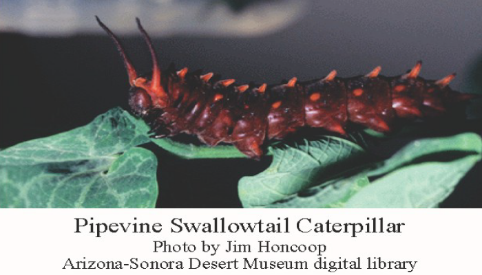 The caterpillar feeds on the poisonous host plant, Aristolochia, also known as the pipevine, Dutchman’s pipe or birthwort. It contains the lethal toxin aristolochic acid. The caterpillars are immune to this poison, but it makes both the caterpillar and butterfly poisonous to predators (and humans).