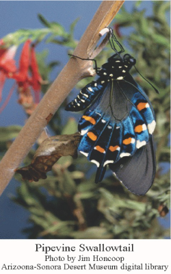 One of my favorite butterflies is the Pipevine Swallowtail (Battus philenor) which is common in the Tucson area. It is a large butterfly with a wingspan of about 3.5 inches. This butterfly ranges throughout the U.S. and Central America.